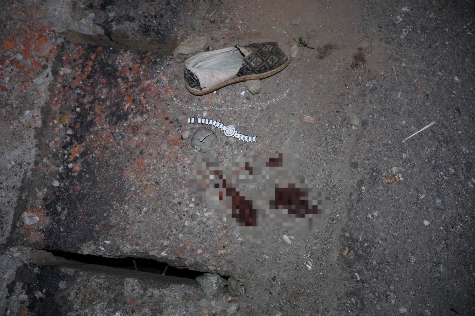 被肁逃車輛撞倒婦人留在路面上方的血跡及鞋子。翻攝畫面