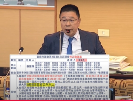 蔡育輝說,雖然其他直轄市及縣市都將近設範圍定為200公尺,但,司法院釋字第738號解釋,本地方自治事項,地方政府可在法律所訂的自治事項範圍內,以因地制宜為考量,制定更嚴格的規範,因此特別提案修正台南市休閒活動場館市業管理自治條例第5條第1項,離學校住宅500公尺以上,並刪除第10條2項刪除,此乃開六都之先河之舉,希望能成為其他五都和縣市的典範。