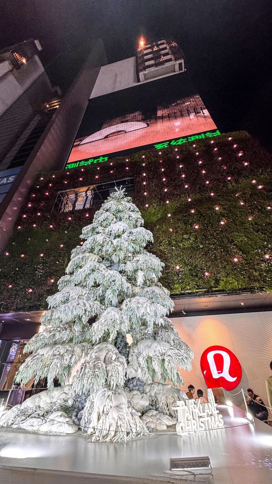 勤美誠品西側平台上的7米高雪景聖誕樹    每日整點的飄雪特效(視傳媒記者 趙明慧/台中攝影)