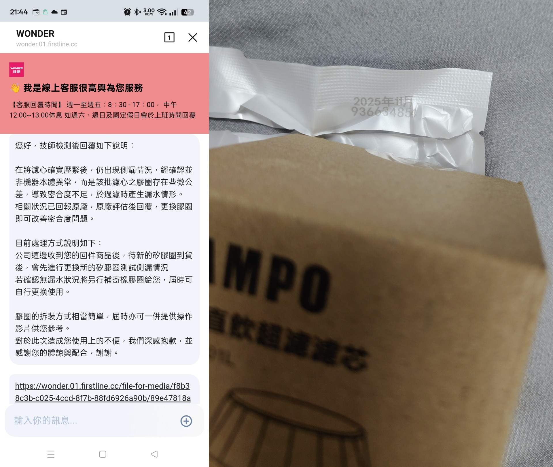 爆料民眾表示,1 月 21 日他收到更換的濾芯與支架後,但裝上後漏水問題依舊。客服與技師後續坦承,該批次濾芯之膠圈存在「公差」,導致密合度不足,並承諾補寄矽膠圈解決。然而至 2 月 10 日,實際僅收到一顆效期標示為 2025 年 11 月 的同批次濾芯,未收到任何矽膠圈,核心問題仍未解決,導致機器至今仍處於無法安心使用的狀態。