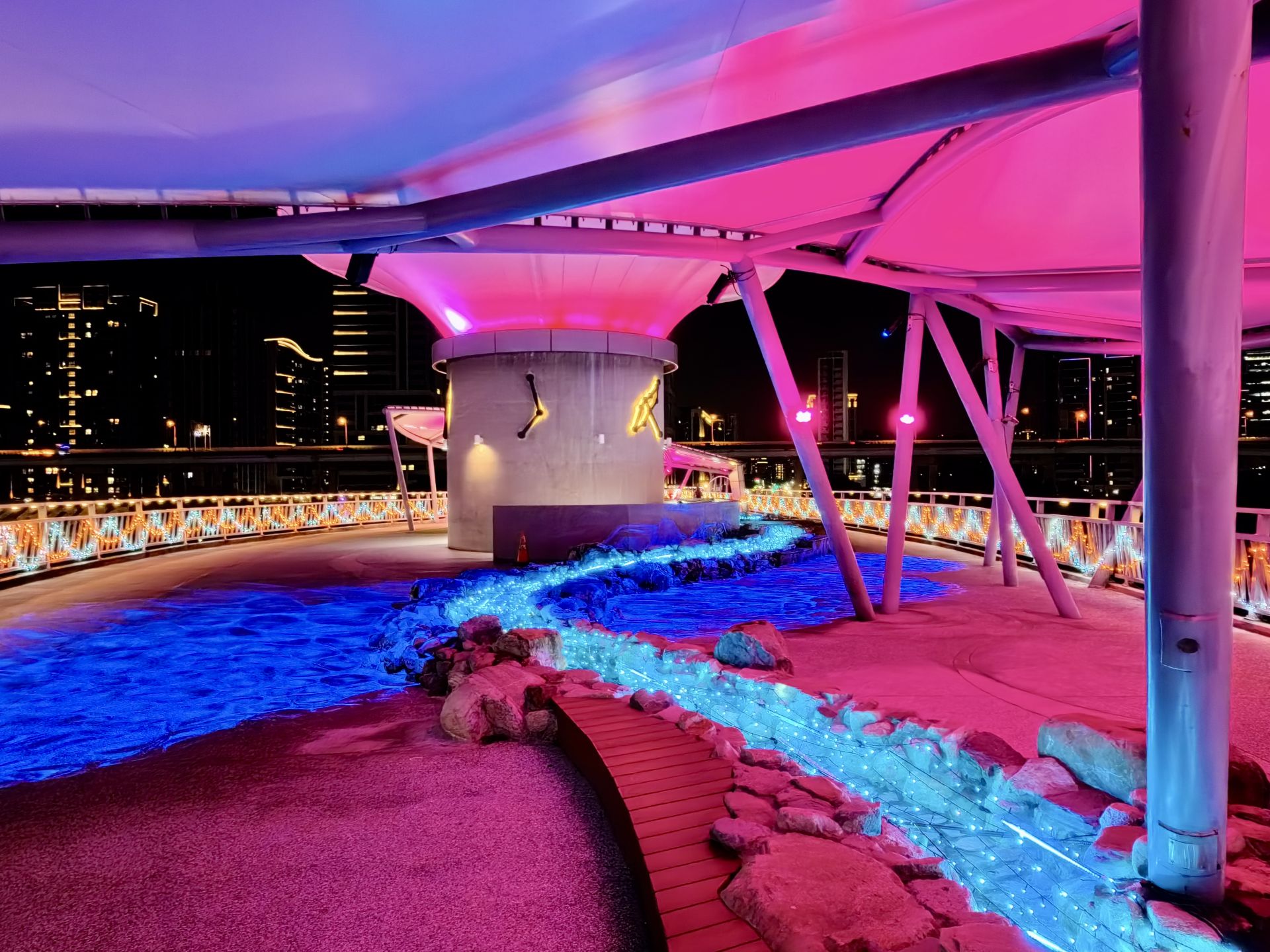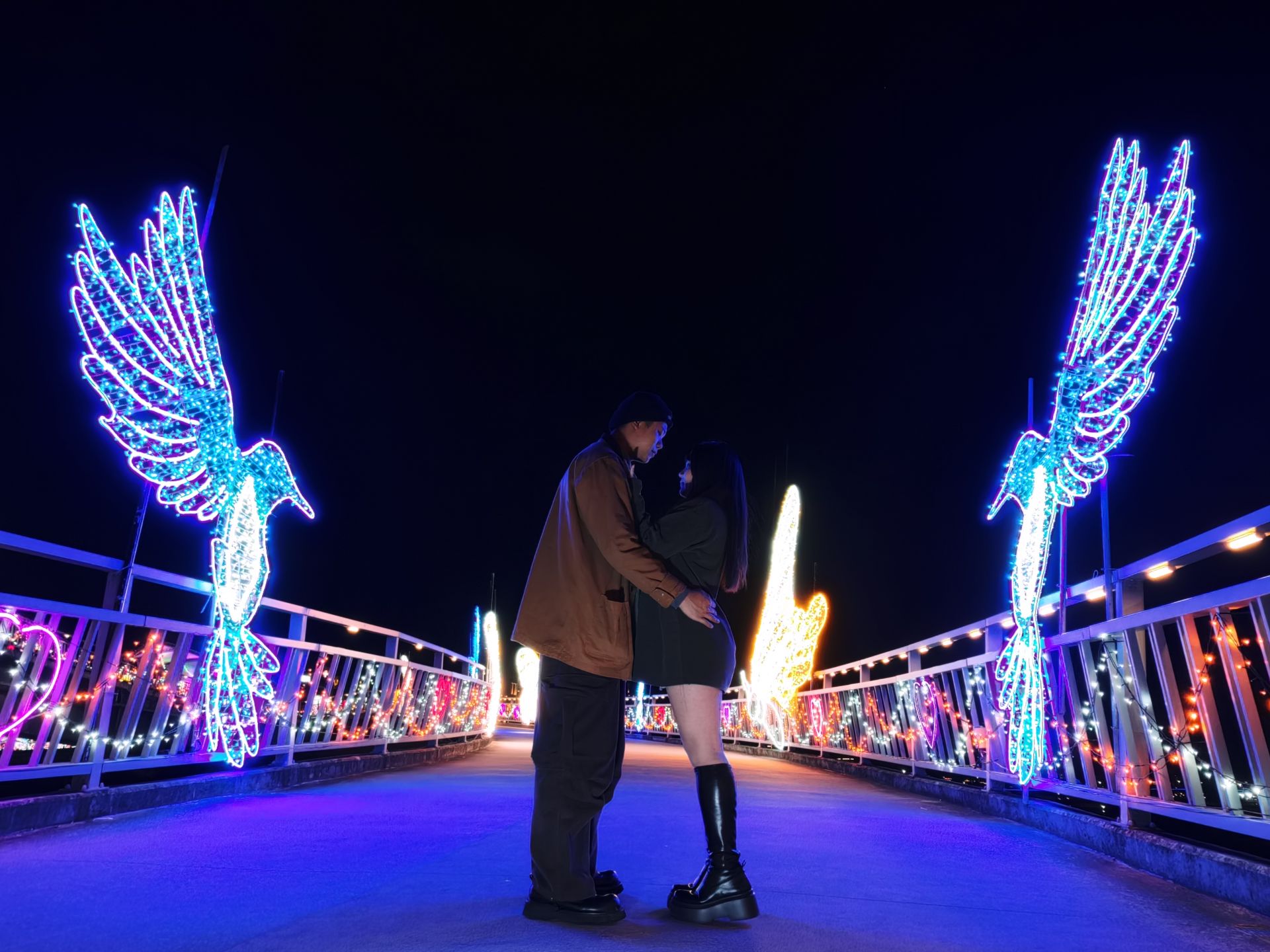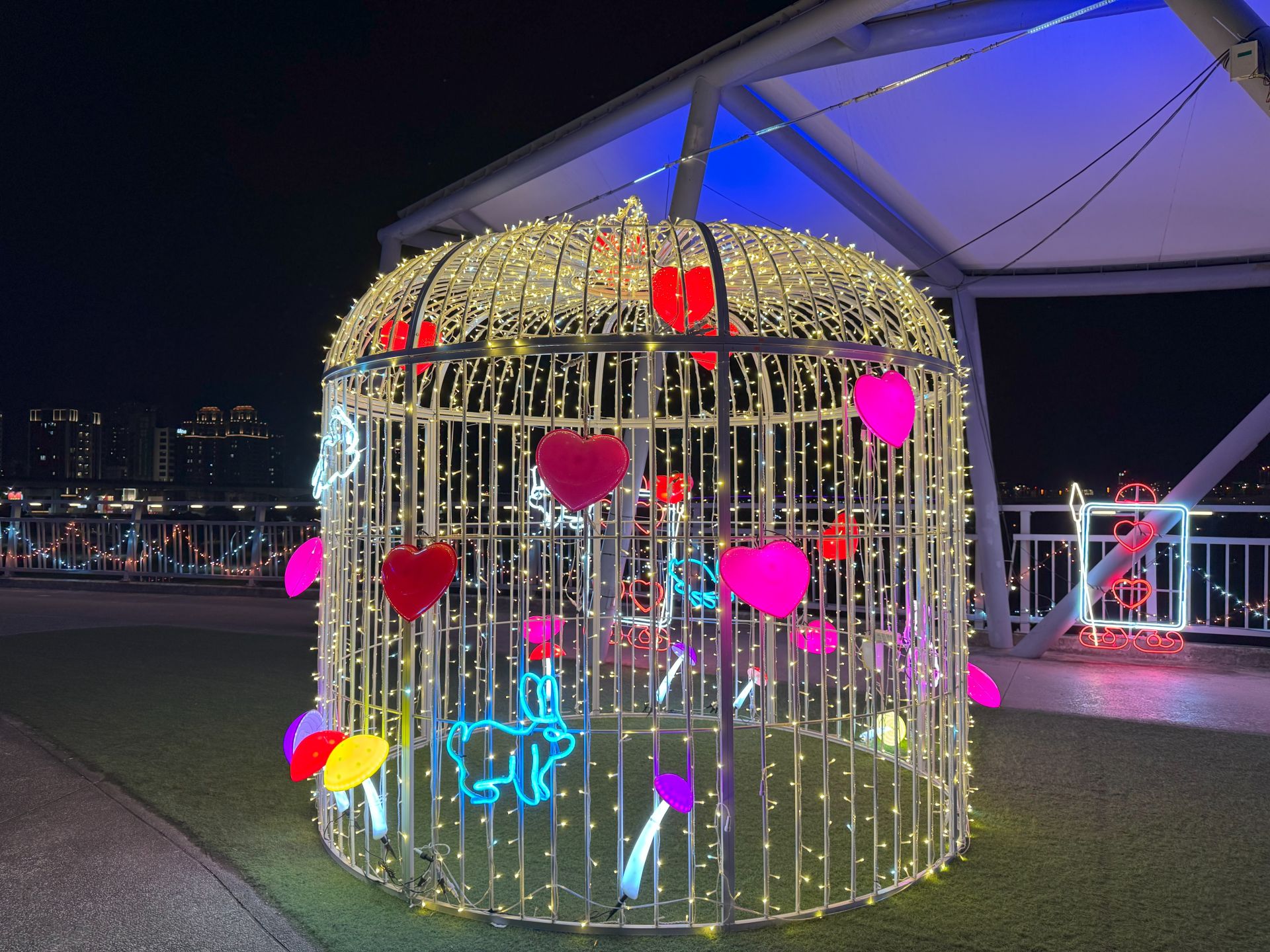 走上辰光橋,光雕主題之一「星戀步橋」以水波紋燈光鋪陳橋面,光影隨腳步流動,如月色輕灑河面,搭配白光與珊瑚橘星星燈串,營造滿滿儀式感;延伸至「星戀草坪座」,柔和燈串搭配飛舞的蝴蝶、蜻蜓燈飾,將成為情侶拍照、親子停留的夢幻打卡點。