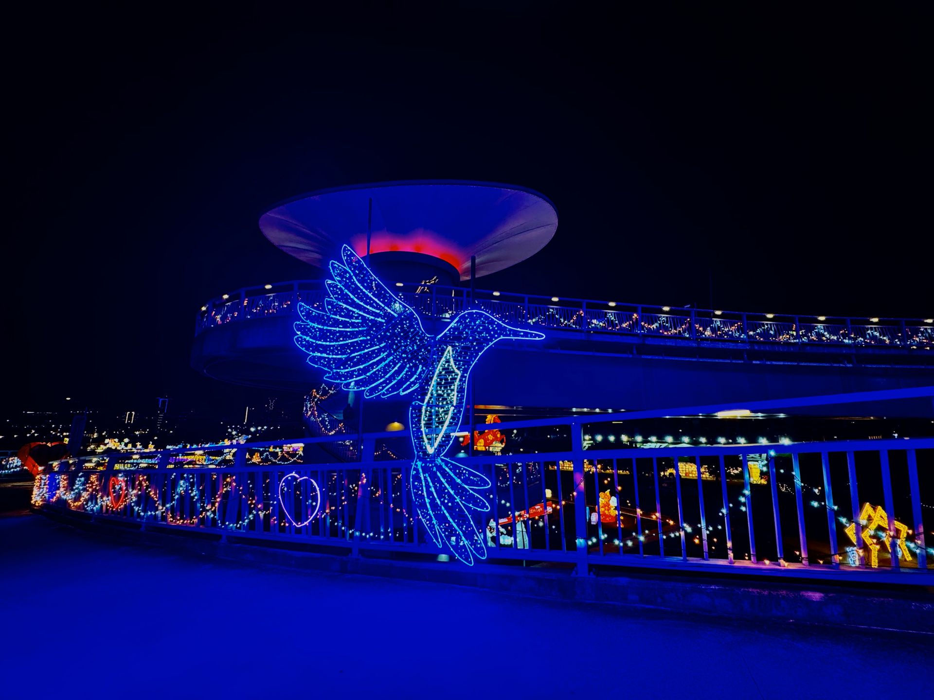 橋中央的「心境奇域」更是一大亮點,童話風格的奇幻夢境場景,懸掛紅色愛心燈片、流星光影與撲克牌愛心元素交錯,彷彿踏入一座只屬於夜晚的秘密國度,讓大小朋友都能沉浸其中。