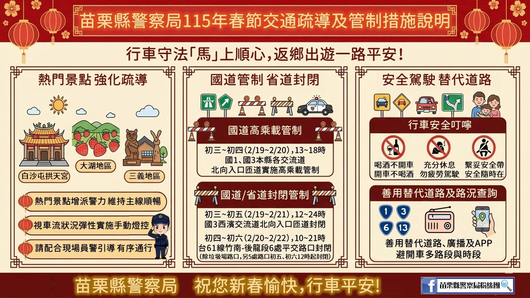 為確保115年春節9天連假期間民眾返鄉團圓及出遊行程順暢平安,苗栗縣警察局大湖分局已針對轄內各大觀光景點及重要交通路段完成現地會勘與勤務規劃,春節期間將全力投入交通疏導工作,同時結合科技工具輔助執行,協助用路人即時掌握交通資訊,避開車流壅塞路段,讓返鄉及旅遊行程更加安全順暢。