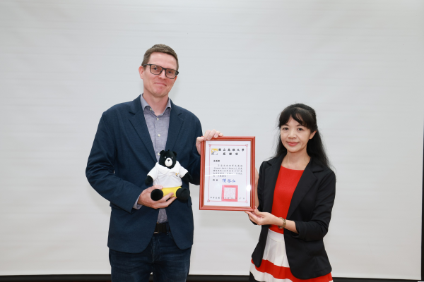 高雄大學人文社會科學院院長賴怡秀代表校方歡迎並致贈感謝狀。賴怡秀致詞中分享,自己過去於英國求學期間,便對芬蘭的社會制度與文化深感興趣。她表示,引進國際專家的實務觀點,能協助學生深入認識不同國家的制度差異,培養多元思考能力。
