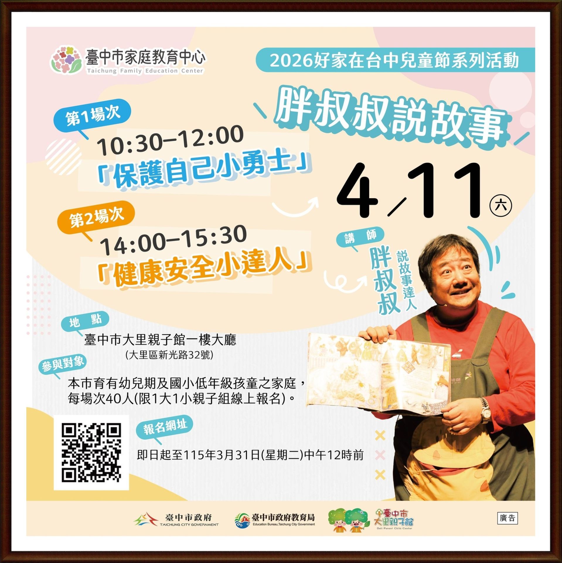 (記者 林嘉睿/台中報導) 兒童節限定!台中市家庭教育中心今年別出心裁,熱血推出「2026好家在台中-兒童節系列活動」,規劃8場超有感、免費親子共學課程,從生動故事、專業講座到震撼的實境體驗,邀請大小朋友一起化身「安全守護者」,在歡笑中學會保護自己。其中最吸睛的重頭戲「小小防災英雄—921地震教育園區親子共學營」將於4月18日、25日熱血登場,讓超萌小英雄不僅學知識,更把「保命技能」帶回家,是送給孩子最棒的兒童節禮物。
