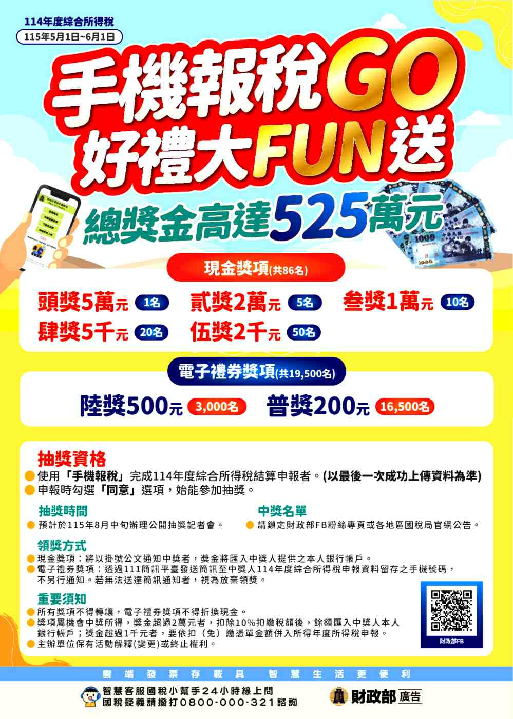 鼓勵使用手機申報114年度綜所稅 財政部舉辦「手機報稅GO.好禮大FUN送」抽獎總獎額共525萬元